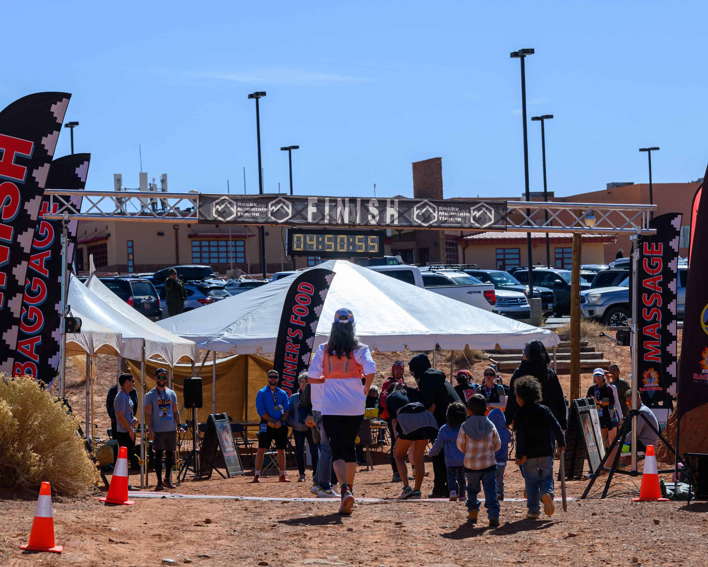 Julie crossing the finish line at the 2025 Monument Valley half marathon.